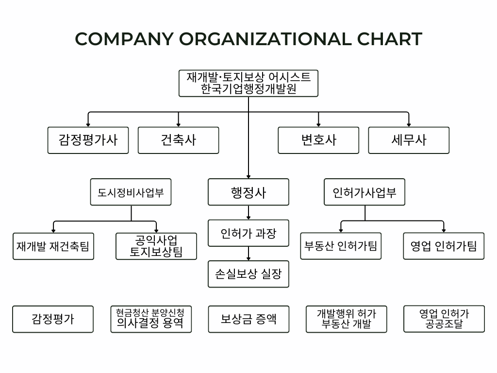 재개발·토지보상 어시스트(한국기업행정개발원) 는 의뢰인의 권리 구제와 성공적인 사업 진행을 위해 각 분야의 전문가들이 협력하는 원스톱 종합 솔루션을 제공합니다.